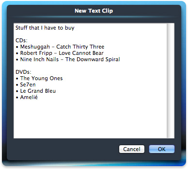 You can quickly create a new text clipping by clicking an empty bin. Doing so opens a dialog that enables you to type the text of the clipping.