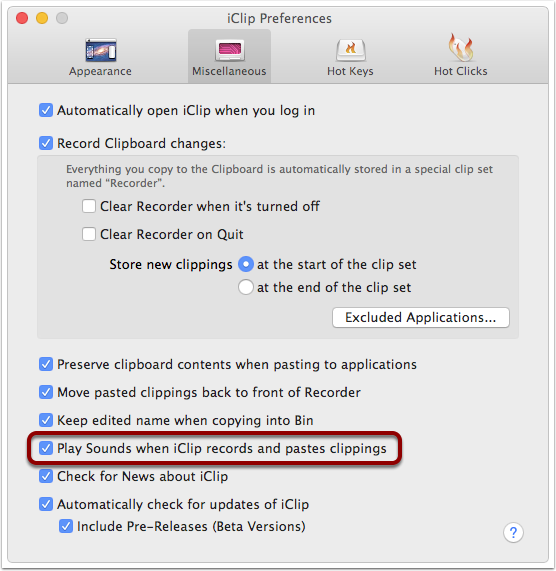 By default, iClip plays a "whit" sound whever it records or pastes a clipping. This article explains how to customize when and which sounds are played.